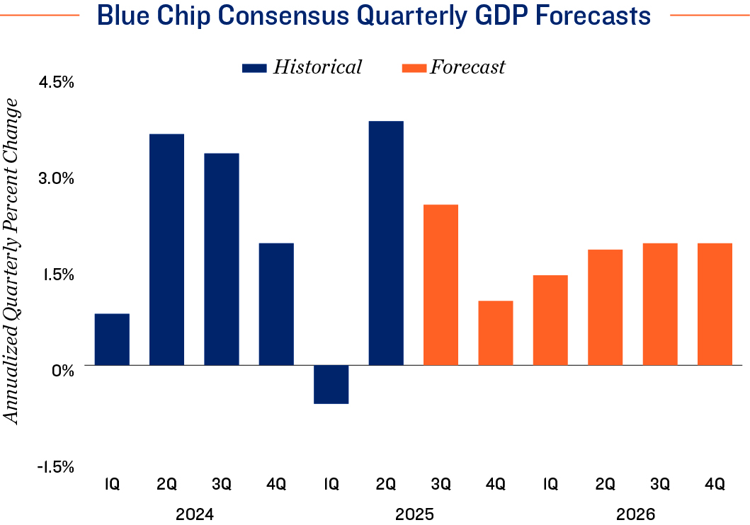 - The Blue Chip consensus forecast, representing the assessments of 44 economists, anticipates GDP growth of around 2.5 percent for the third quarter of this year, slowing to an annualized gain of 1.0 percent for the closing period of 2025.