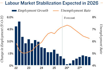 Industrial property sector may find firmer footing next year. After a brief rebound in late 2024 and early 2025, leasing momentum softened once again as renewed trade uncertainty and U.S. tariffs weighed on business expansion plans. Net absorption slipped back into negative territory in the second quarter and stayed muted in the third, pushing the national vacancy rate up to 3.7 per cent as of September. Still, early signs of stabilization are beginning to emerge. Manufacturing employment led September’s job gains, rising by 28,000 positions – a potential signal that tariff-related headwinds are easing. At the same time, Canada’s industrial construction pipeline – while still elevated compared with historic standards – is winding down, alleviating some supply-side pressures. Combined with growing trade clarity and a more accommodative monetary backdrop, fundamentals appear poised to gradually improve through the latter half of 2026.