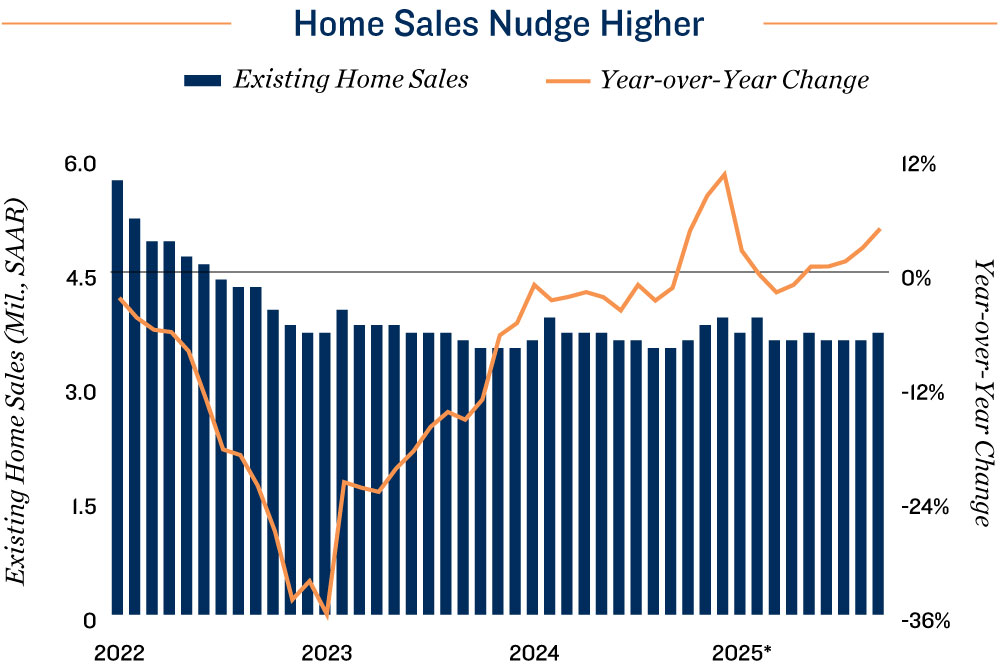 Home sales pick up amid lower rates. The number of existing homes sold climbed 4.5 percent year over year in September, the fastest pace so far in 2025. This increase was correlated with a drop in the 30-year mortgage rate to 6.35 percent, the lowest monthly average in a year. Since then, the measure has trended down even further to under 6.20 percent, aligning with a decline in the benchmark 10-year Treasury, which fell below 4.0 percent in late October. Further contraction is not guaranteed, however, especially if inflation stays in the 3 percent zone and U.S. government debt issuance increases. Gross national debt widened by $1 trillion over the past two months, the fastest such accumulation since the pandemic. Without a more substantial downshift in mortgage rates, home sales may remain subdued.