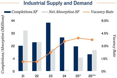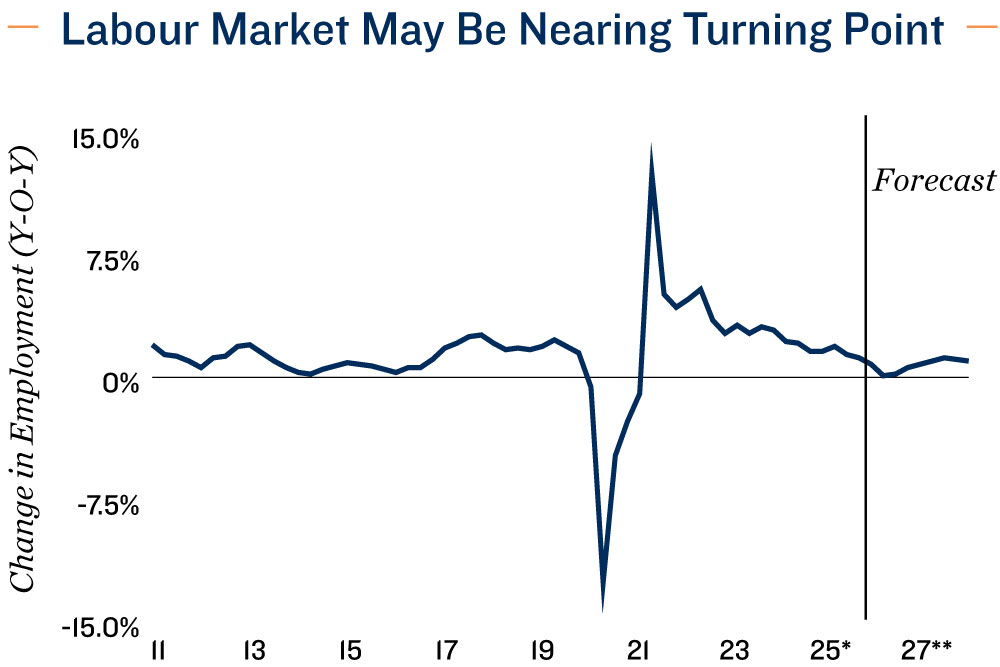 Industrial momentum signals potential market turning point. October’s hiring surge across trade-exposed sectors may mark an early sign that Canada’s industrial real estate market is stabilizing. As these segments regain footing, demand for logistics and production space could begin to firm through early 2026, setting the stage for a gradual improvement in occupancy and absorption later in the year. This outlook is further supported by a more accommodative monetary policy backdrop, which should bolster consumption and business investment, alongside greater clarity on trade policy and the winding-down of Canada’s historic industrial construction cycle. Together, these forces point to a sector transitioning from correction toward renewed balance, with vacancy likely to peak around 4.0 per cent before inching slightly lower next year.