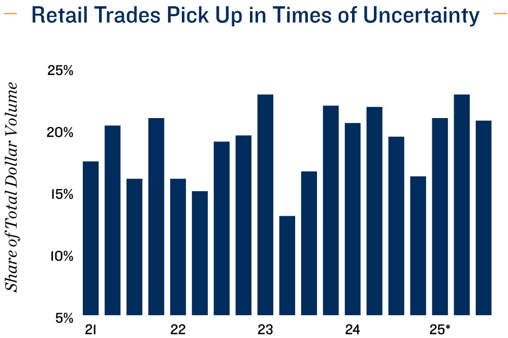 Retail real estate shows strong performance across the spectrum. In the investment market, retail real estate continues to stand out as a preferred option. Grocery-anchored and essential-based centers remain highly sought-after for their defensive characteristics, but 2025’s pickup in discretionary spending has broadened investor interest across the asset class. Retail transaction activity and dollar volumes have both trended higher over the past year, reinforcing the sector’s reputation as a stable, income-driven investment at a time when many other property types are still finding their footing.